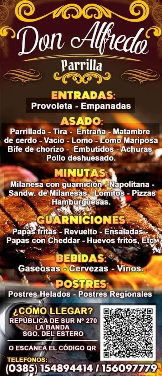 Seen as a whole, the menu at Parrilla Don Alfredo reflects a clear dedication to traditional Argentine flavors, with a strong focus on grilled meats and comforting, well-balanced sides. Dishes like Empanadas de Carne set the tone with their classic, savory filling, offering a familiar and satisfying start. The grill truly takes center stage with hearty plates such as Matambre Al Verdeo Con Fritas, where tender beef paired with green onion sauce and crispy fries highlights the restaurant’s mastery of parrilla-style cooking. Equally robust are Matambre de Cerdo Y Costillas Asadas and Asado Banderita A la Parrilla, both showcasing smoky aromas, well-rendered fats, and generous portions that appeal to meat lovers. For those seeking something slow-cooked and rustic, Chivito Al Horno Con Verduras Salteadas Variadas and Chivo Con Papas deliver rich, home-style flavors, balancing roasted meats with vegetables or potatoes for a complete, satisfying meal. Simpler accompaniments like Papas Fritas and Ensalada Completa Mediana work effectively as sides, adding either crunch or freshness to heavier dishes. The menu also caters to more familiar comfort options with Milanesa de Pollo Con Patatas Fritas, offering a crispy, approachable alternative without straying from the restaurant’s traditional identity. To round out the experience, Vino complements the grilled offerings, reinforcing the sense of a classic Argentine dining table. Altogether, the menu feels cohesive and intentional, centered on generous portions, honest ingredients, and time-tested recipes that define the parrilla tradition without unnecessary embellishment.